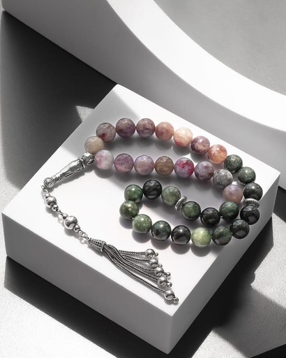 سبحة فضة حجر تورمالين وردي وسيرافينيت